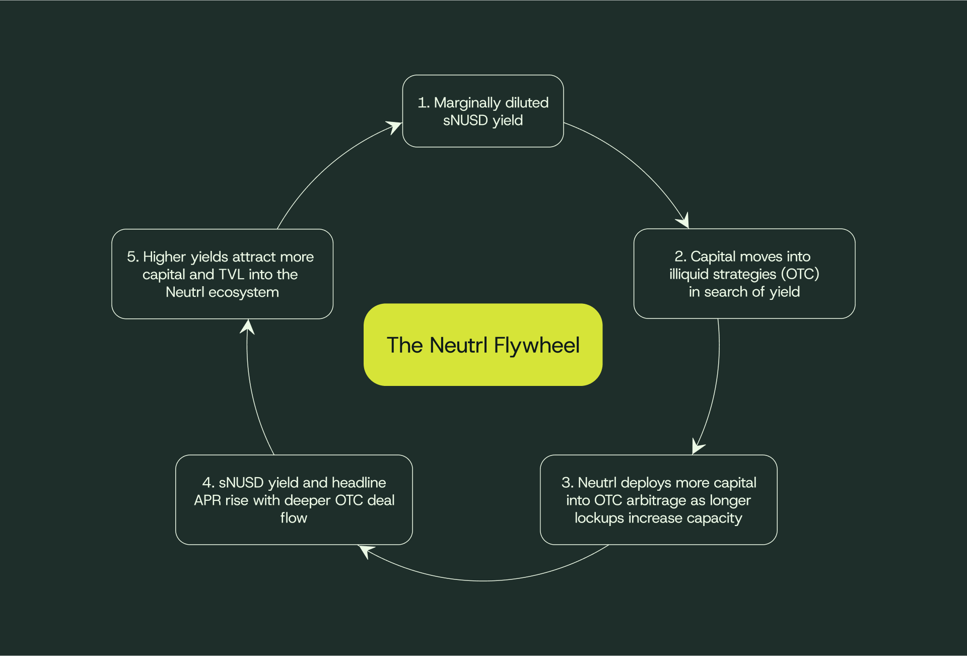 This positive feedback loop continues until the market exhausts attractive longer-tenor opportunities. Because the flywheel mechanism is fully automated—without discretionary adjustments or human committees—Neutrl can navigate volatile market conditions while maintaining smooth redemptions and competitive yields. Increased deposits expand capacity, higher capacity raises yields, and rising yields attract further deposits.