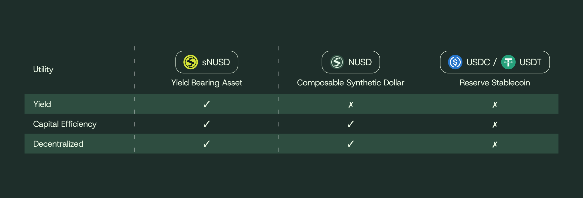 NUSD and sNUSD are fully-backed, yield-bearing, and highly capital efficient, with a clear path towards decentralized governance.