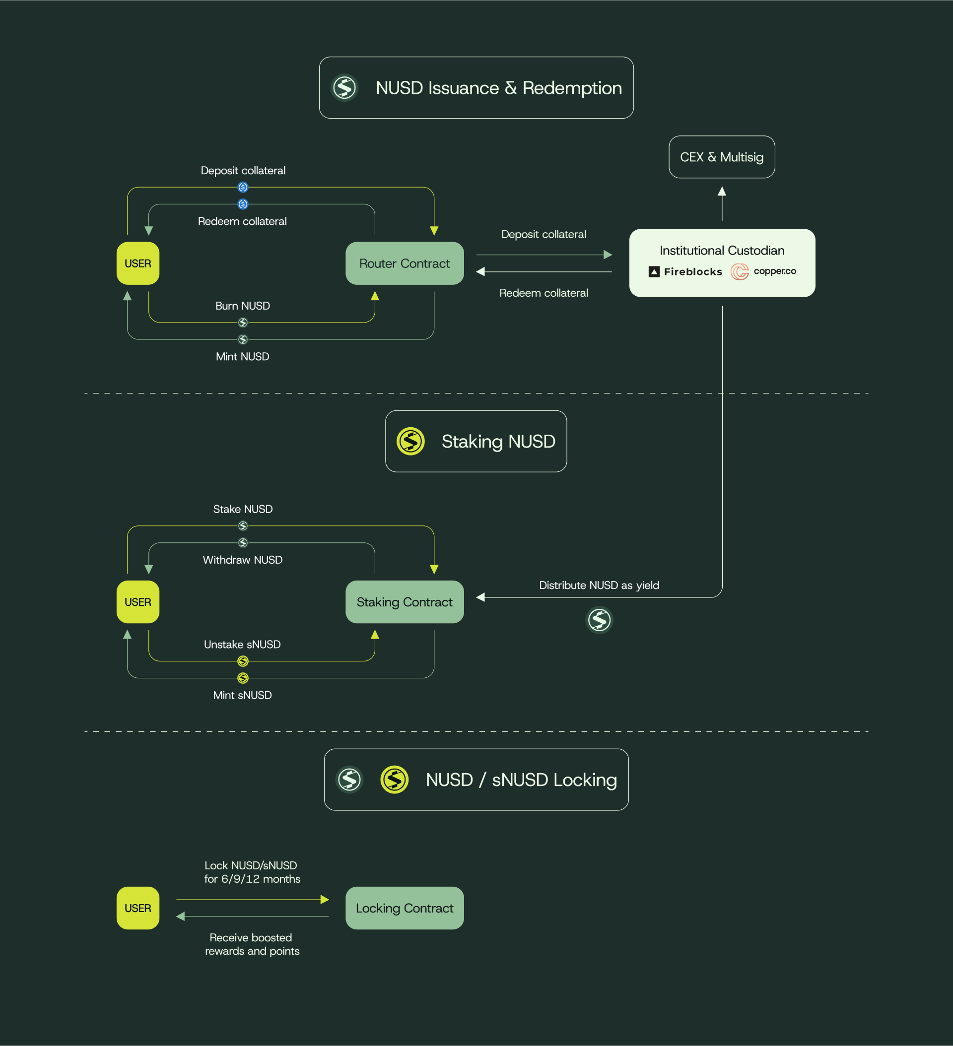 - NUSD is an ERC20, with plug-and-play across CEX margin accounts, DeFi money-markets and onchain primitives.